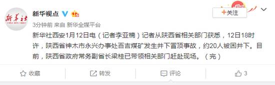 记者从陕西省相关部门获悉,12日18时许,陕西省神木市永兴办事处百吉煤矿发生井下冒顶事故,约20人被困井下。目前,陕西省政府常务副省长梁桂已带领相关部门赶赴现场。