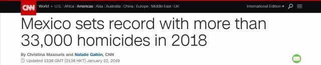 1月22日,美国有线电视新闻网(CNN)报道称,墨西哥2018年发生的有记录在案的凶杀案,已超过3.3万起,是统计以来最高纪录。