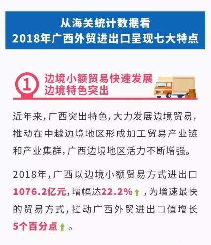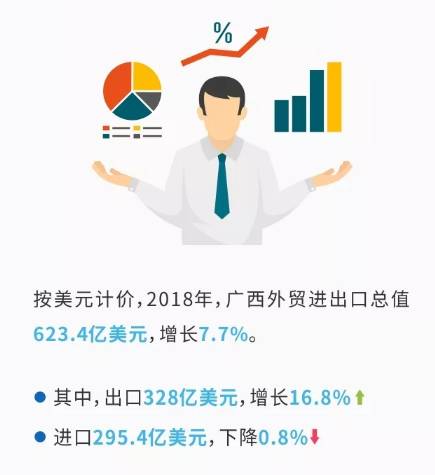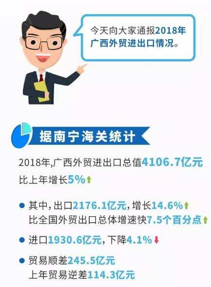 1月25日,南宁海关与广西商务厅发布2018年广西外贸数据及2018年优化广西外贸营商环境、推动口岸通关提效降费工作取得的成效。据统计,2018年,广西外贸进出口4106.7亿元人民币,比上年增长5%,进出口规模创历史新高。