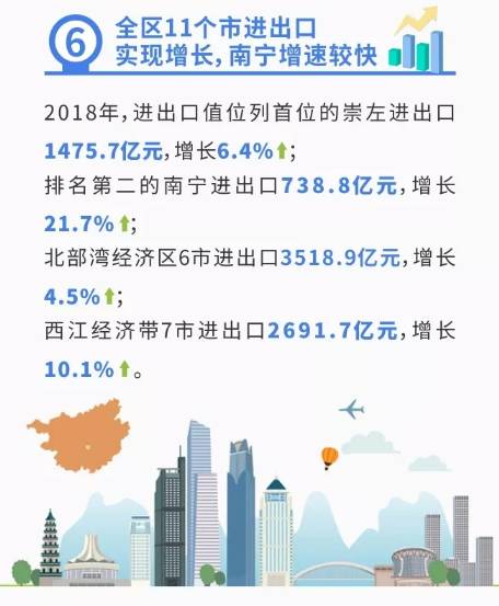 2018年,全区11个市进出口实现增长,进出口值位列前三的为崇左、南宁、防城港,其中南宁增速较快。