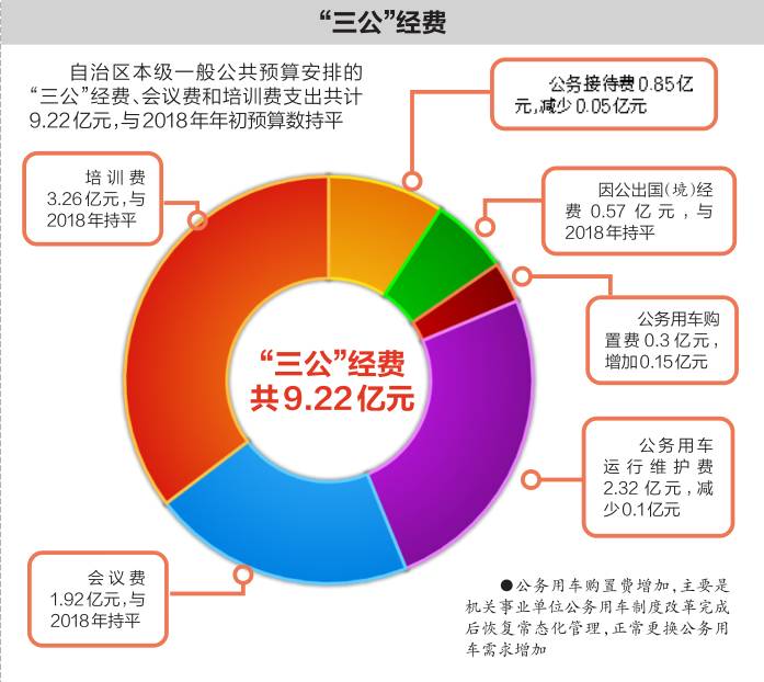 2019年,自治区本级一般公共预算安排的“三公”经费、会议费和培训费支出共计9.22亿元,与2018年年初预算数持平。