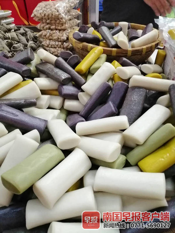 除了年粽,年糕、粉利也是必备的年货之一。在水街,粉利有传统的白色、红色粉利之外,还有用植物染料染成的紫色、绿色、黄色粉利。