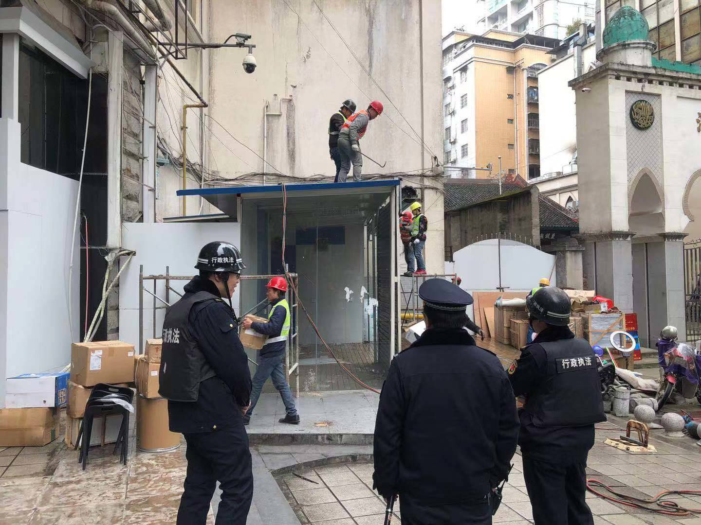 当日,城管队员还分别拆除了景行路、公园路中环大厦的3处违法搭建门面。