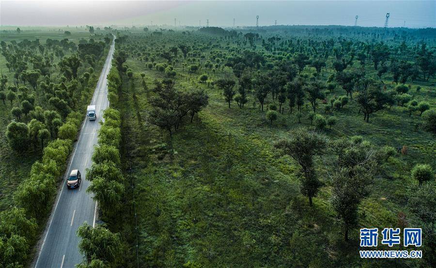 ▲汽车行驶在陕西榆林市靖边县东坑镇新建村的道路上(2018年8月1日无人机拍摄)。陕西省开展的天然林保护工程和全面治理荒沙行动,极大改善了毛乌素的生态环境,也使沙漠南缘的陕西省榆林市实现从“沙进人退”到“绿进沙退”的转变。 新华社记者 陶明 摄