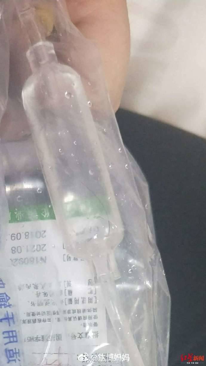 这位姓孙的女士向红星新闻反映,她于3月17日将高烧的孩子送到北华大学附属医院儿内科住院治疗,“医生告诉我孩子感染了肺炎,一个疗程下来得三周”。“3月23日晚上,护士换完第二瓶消炎药(头孢)便出去了”,孙女士发现吊瓶没有滴了,准备自己调,意外发现滴管内有根头发。