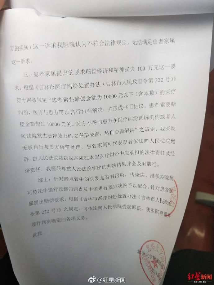 3月26日一早,孙女士收到北华大学附属医院投诉管理办公室的书面回复。回复意见称:针对静点管中的头发是否有污染、传染病,潜伏期家属可依法申请行政部门调查及申请鉴定,院方予以配合。其中显示,家属曾向院方索赔100万经济及精神损失。对此孙女士也承认,“是因为医院一直没有给出解决方案。”