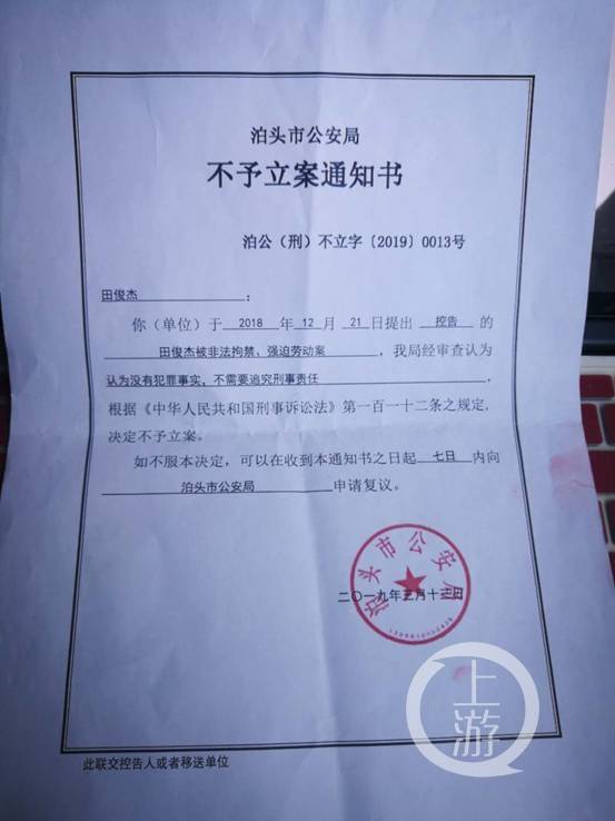 今年3月13日,河北省泊头市公安局下达了不予立案通知书。该通知书称:“你单位于2018年12月21日提出控告的田俊杰被非法拘禁、强迫劳动案。我局经审查认为没有犯罪事实,不需要追究刑事责任。根据《中华人民共和国刑事诉讼法》第一百一十二条规定,决定不予立案。”