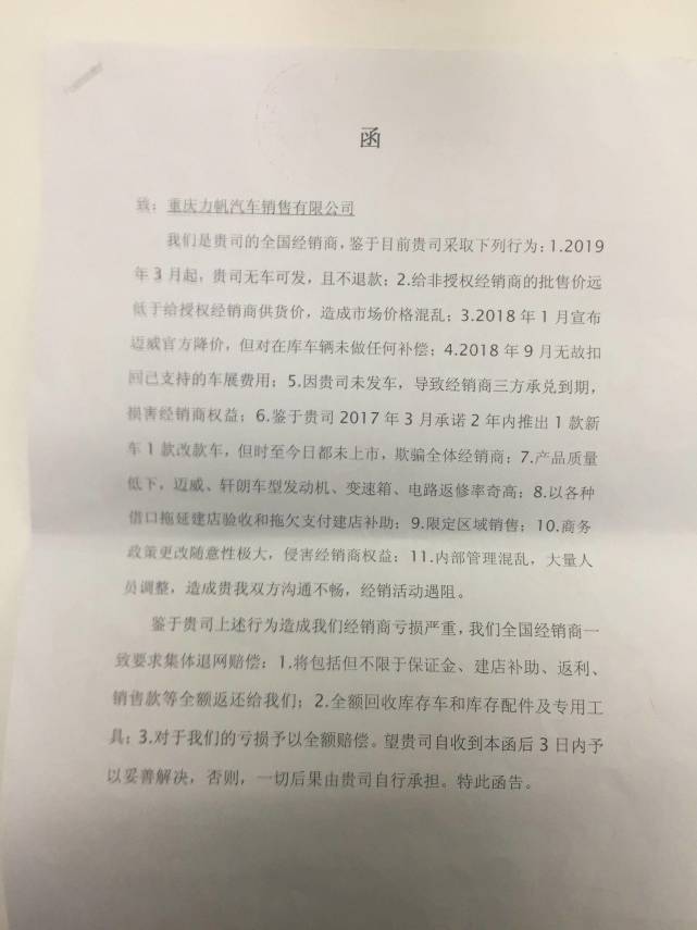 为了“要个说法”,力帆经销商通过微信群自发组织维权,于3月2日和4月24日分别向力帆公司高层和当地政府发函,但至今未收到回复。