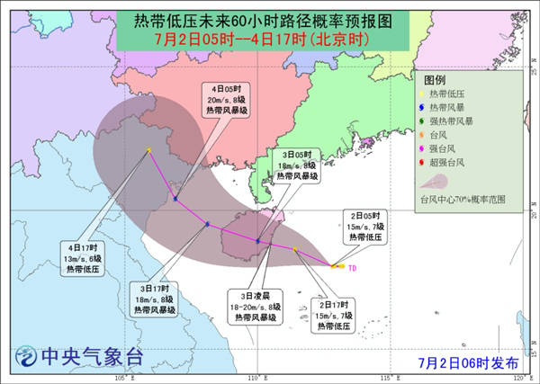 据中国天气网消息,中央气象台7月2日06时发布热带低压预报: