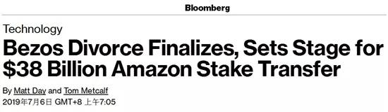 彭博社7月6日的报道说,今年1月,贝索斯和麦肯齐宣布结束25年婚姻。根据协议,麦肯齐将分得4%的亚马逊股份,价值约380亿美元(约合2619亿元人民币)。同时,麦肯齐将她此前拥有的《华盛顿邮报》和太空探索公司Blue Origin的所有股份都转让给了贝索斯。这是麦肯齐于今年4月在推特上透露的。