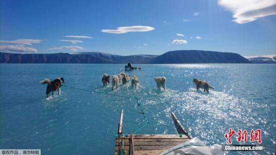▲2019年8月,格陵兰冰川一天融化120亿吨,创历史纪录。图为在格陵兰岛西北部,几只雪橇狗在冰川融化后形成的积水行走。破坏全球经济