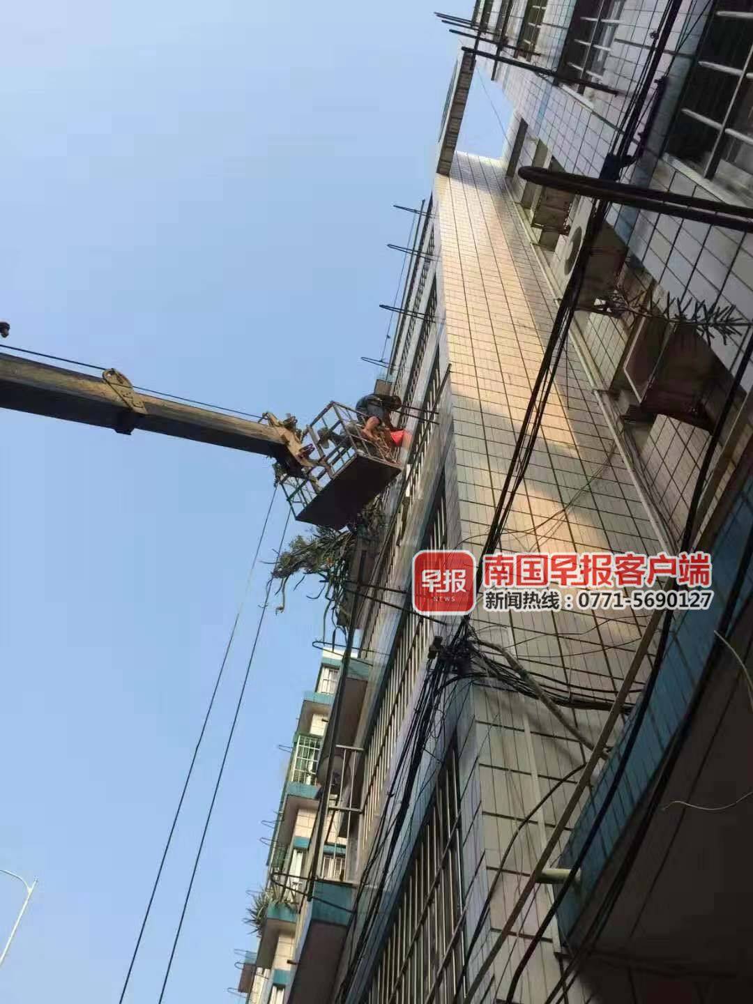 8月24日,南宁市中华路一小区一名4岁女童爬上窗户,头部被防盗窗卡住,身体悬在窗外。危急时刻,热心市民叫来附近施工的吊车,两名师傅配合默契,一人操作,一人坐上吊篮把孩子安全救下。