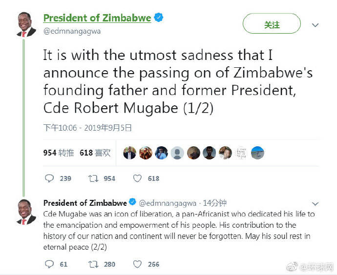 据新华社此前报道,1980年津巴布韦独立后,穆加贝出任实权总理。1987年津巴布韦改行总统制后他担任总统,并于1990年、1996年、2002年、2008年和2013年连任。2017年7月21日,津巴布韦众议长雅各布·穆登达21日宣布,津巴布韦总统罗伯特·穆加贝辞去总统职务,并立即生效。
