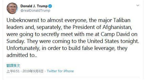 “几乎所有人都不知道,塔利班主要领导人和阿富汗总统分别计划周日来美国与我见面”,美国总统特朗普7日发推特称,但因为塔利班日前在喀布尔制造爆炸造成包括一名美国士兵在内的12人死亡,“我决定取消这一会面和和平谈判”。