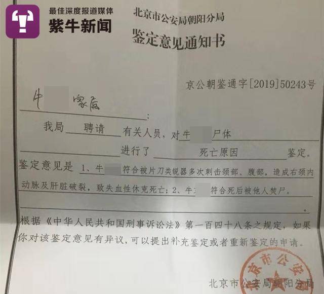 12月26日,刘先生告诉记者一个最近情况:家属拿到了北京市公安局朝阳分局出具的《鉴定意见通知书》。这份通知书显示,牛某杰符合被片刀类锐器多次刺击颈部、腹部,造成右颈内动脉及肝脏破裂,致失血性休克死亡;符合死后被他人焚尸。通知书落款处盖有北京市公安局朝阳分局的公章。