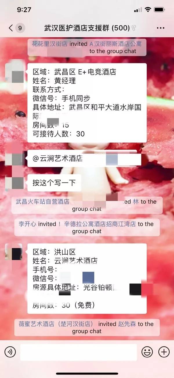 “武汉医护酒店支援群”的群主肖雅星是武汉当地的酒店业主,其名下的4家酒店全部参加此次支援。记者看到,肖雅星一边在各群联系、协调寻找包括84消毒液、口罩和紫外线灯等物资供应商,一边不断在群内发布自拟的《民间酒店入住人员与商家须知》。《须知》中,肖雅星提醒医护人员自行做好防护,建议他们携带一次性用品;请酒店人员做好准备,记得退房后用75%医用酒精消毒……