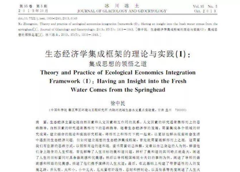 1.徐中民为原中国科学院寒区旱区环境与工程研究所(现已整合入我单位)研究员,2000年博士研究生毕业留所工作,博士生导师为程国栋。其撰写的《生态经济学集成框架的理论与实践》分上下两篇,于2013年11月25日刊发在《冰川冻土》杂志。