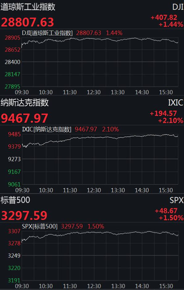 截至收盘,道指收盘上涨407.82点,涨幅1.44%,报28807.63点;纳指涨194.57点,涨幅2.10%,报9467.97点;标普500指数涨48.67点,涨幅1.50%,报3297.59点。