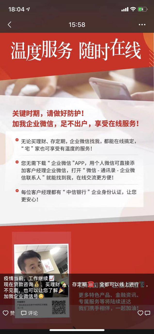面对客户当前足不出户的金融需求,中信银行南宁分行利用企业微信、微信、电话等多种方式在线解疑答惑,与客户保持密切联系,并积极引导客户使用手机银行、网上银行办理业务,处理业务,实现无论买理财、存定期,都能在线搞定。南宁分行用中信人的敬业、专业,保证客户的服务不断档,使客户“宅”在家也可享受有温度的服务。