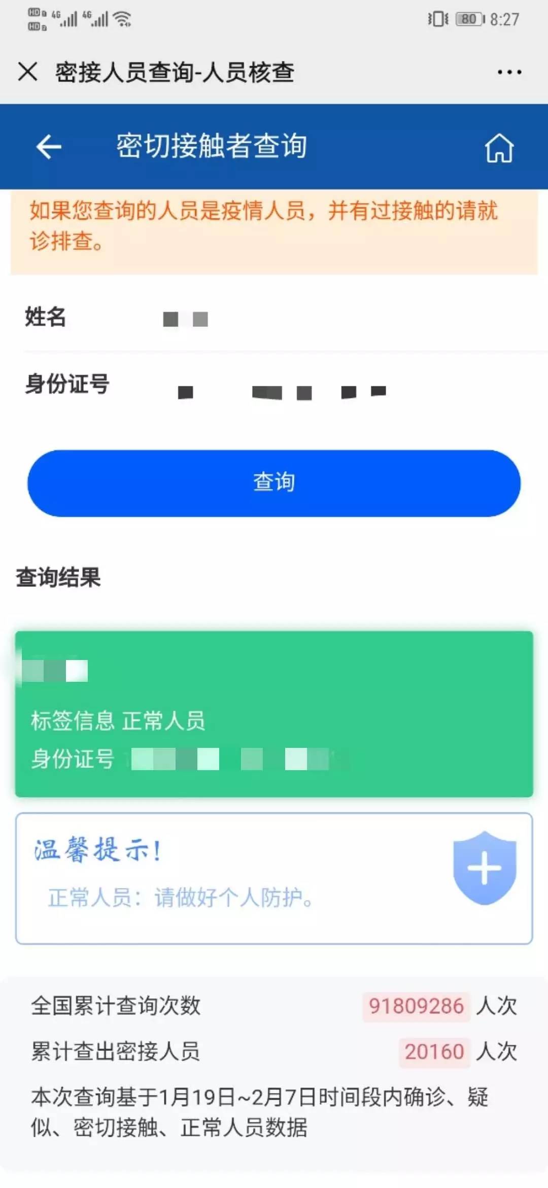 查询结果如显示是正常人员,那么恭喜您,为您的有效防护点赞。