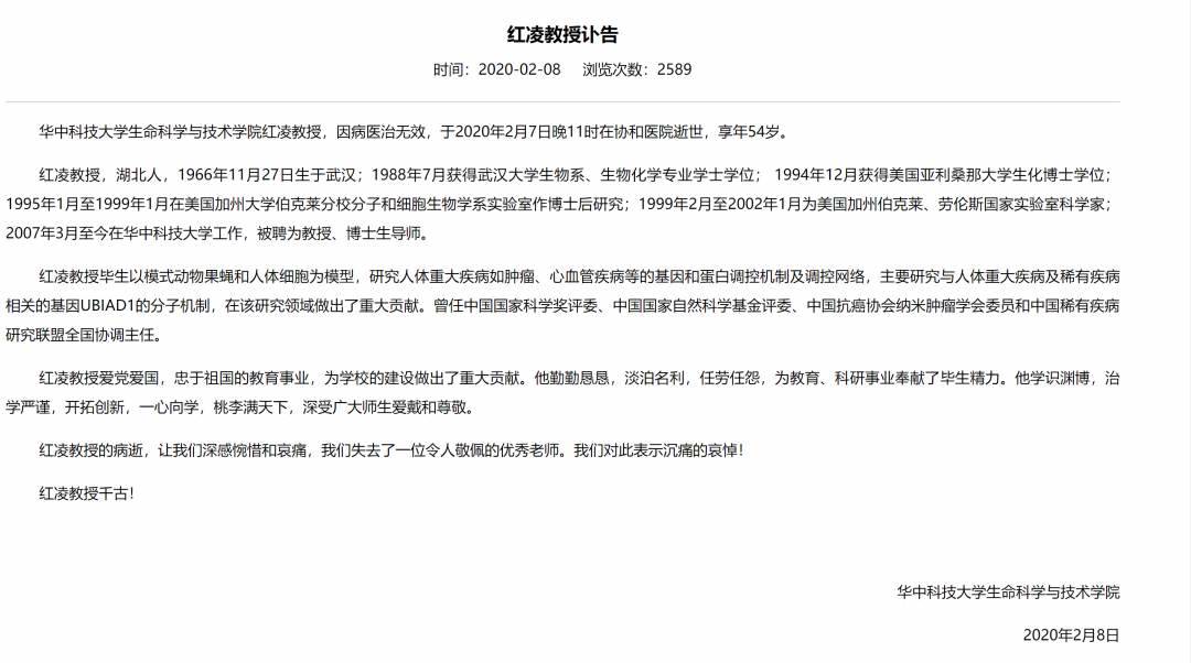 “红凌教授的病逝,让我们深感惋惜和哀痛,我们失去了一位令人敬佩的优秀老师。我们对此表示沉痛的哀悼!”华中科技大学生命科学与技术学院在讣告中表示。