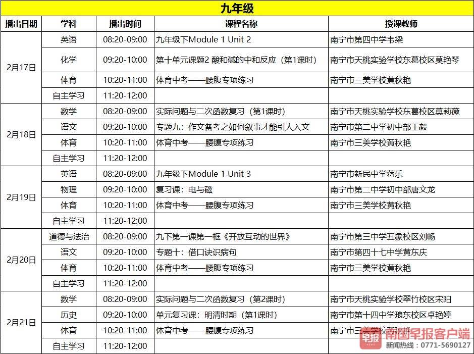 广大学生家长需注意的是,南国早报客户端是自治区教育厅授权的“空中课堂”播出平台,除南国早报客户端以外,自治区教育厅还授权“空中课堂”在广西广电网络电视、广西移动魔百和宽带电视、广西电信和广西联通IPTV、广西广播电视台科教频道等电视平台,广西网络广播电视台等网络平台,以及广西云客户端、广西新闻网壮观新闻客户端、新华网客户端、广西视听移动客户端等手机平台上播出。