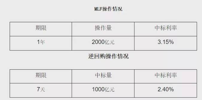 具体来看,1年期MLF中标利率为3.15%,7天期逆回购操作中标利率2.4%。其中,MLF操作利率较之前下降了10个BP。