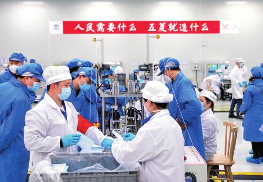 ▲2月16日,工人在广西柳州上汽通用五菱无尘车间生产防护口罩 。