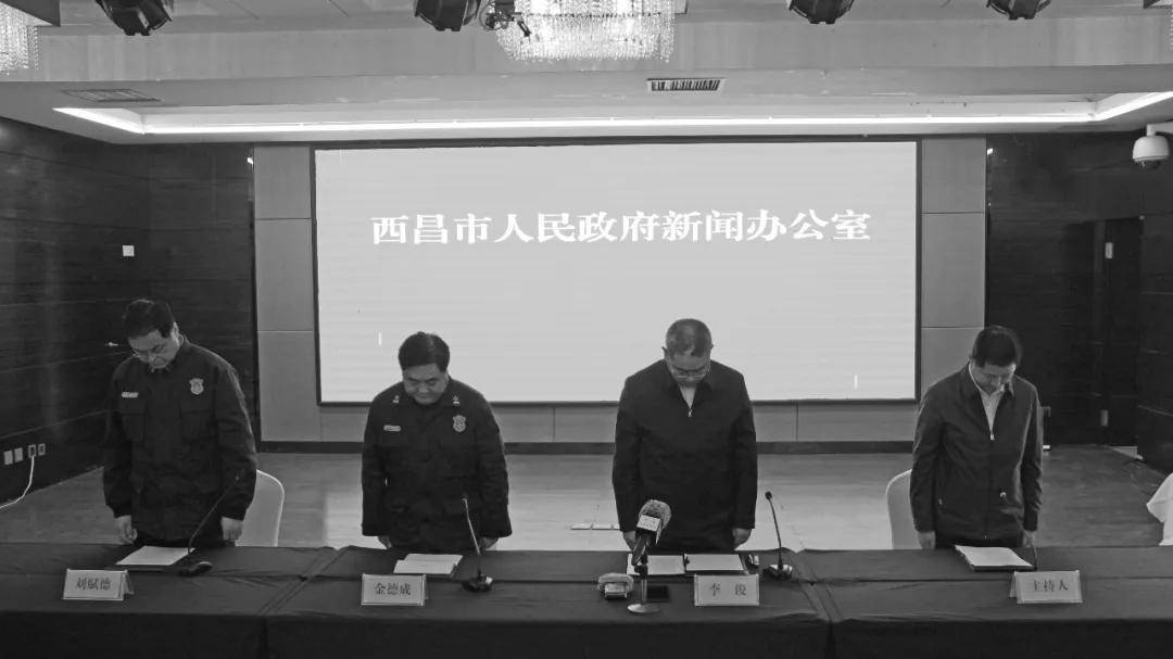 3月31日下午,四川凉山州西昌市人民政府新闻办官方微信“西昌发布”发布西昌市森林火灾情况通报(三),当日17时,西昌市人民政府新闻办公室召开新闻通气会。通气会开始前,全体人员向在这次火灾扑救中牺牲的19位勇士默哀。