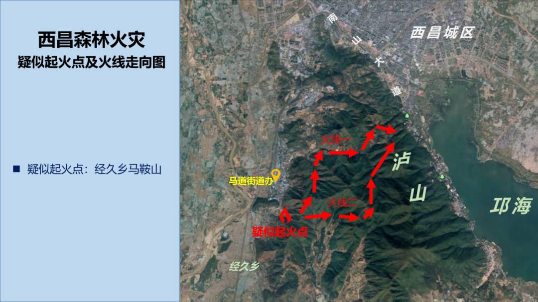 3月以来,西昌进入干风季节,晴热天气异常,已连续20日无任何降雨,湿度仅为5%-10%。特别是3月下旬以来已连续4天高温天气,30日最高气温达到31.2℃,风力7-8级,本次起火点初步判定为大营农场柳树桩,沿经久、马道、泸山后山猛烈扩散,后因风向多变,火情扩散迅速,并伴多处飞火,造成多处多线速燃态势。