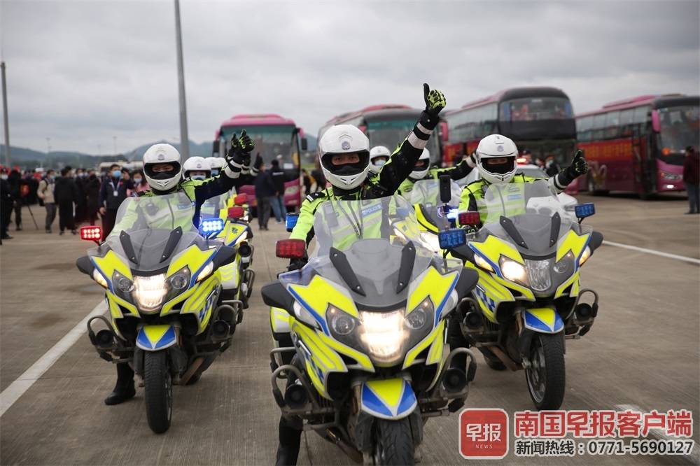 ▲欢迎车队载着队员离开南宁吴圩机场。