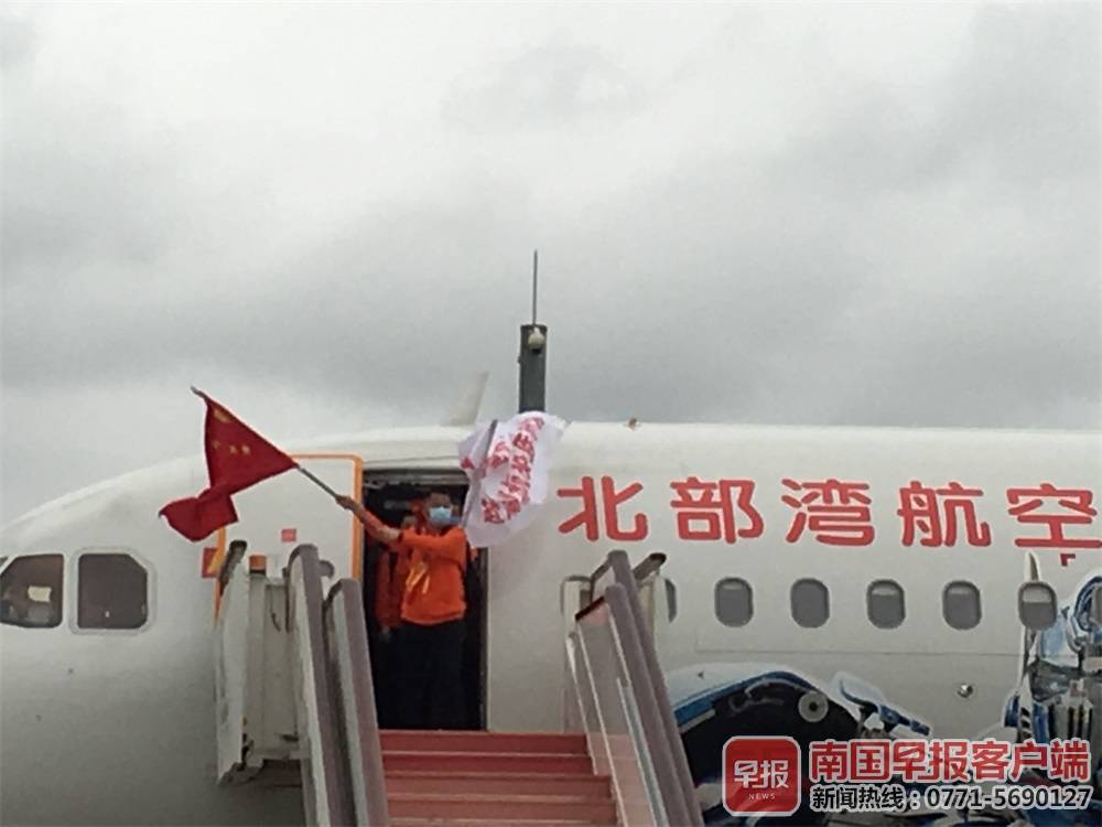 ▲广西第七批援助湖北抗疫医疗队队员在机舱门口挥旗执意。