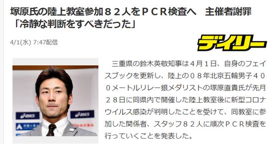 4月1日,日本富士通俱乐部发布消息说,前日本3届全国100米短跑冠军、2008年北京奥运会男子4*100米接力银牌获得者塚原直贵被检测出新冠肺炎阳性。他是第一个被查出新冠肺炎阳性的日本奥运奖牌获得者。