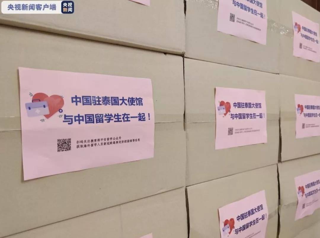 ▲中国驻泰使馆为留学生发放防疫“健康包”。