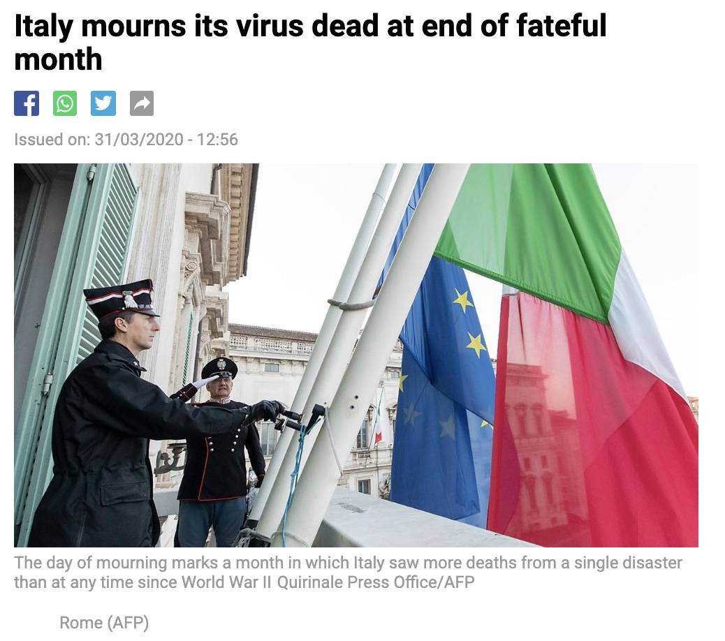 据法新社报道,3月31日,意大利降半旗并举国默哀一分钟,哀悼新冠肺炎疫情中的逝者。截至当地时间30日18时,意大利累计确诊病例101739例,累计死亡病例11591例。