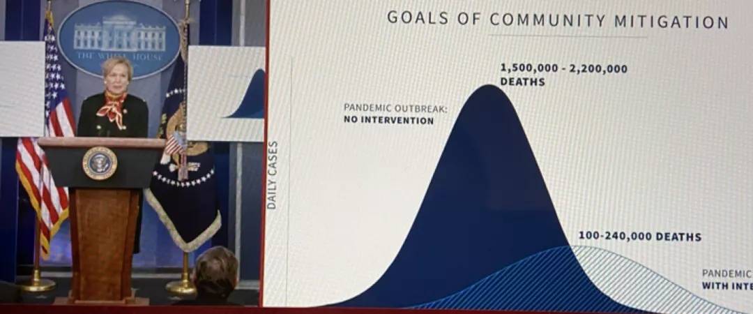 白宫应对疫情小组成员比克斯(Deborah Birx)在发布会现场展示了预测疫情的相关模型。模型显示,在对疫情进行管理干预的情况下,美国新冠肺炎死亡病例也有可能达到10万至24万,如果不加控制,死亡病例可能达到150万至220万。
