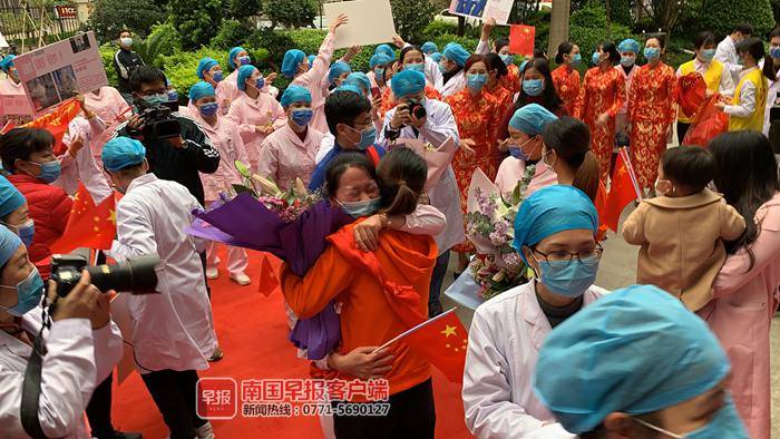 ▲广西区妇幼保健院的医疗队员返回医院后,和同事们激动地抱在一起。