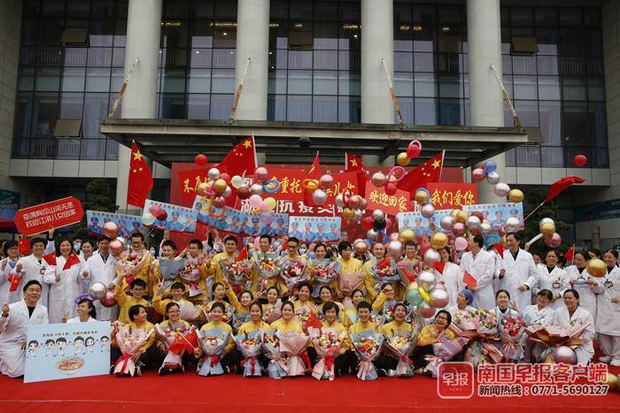 “江滨儿女,欢迎回家,我们爱你!”当天,广西江滨医院为医疗队员的归来举行了热烈的欢迎仪式。在这次疫情中,广西江滨医院派出35名骨干医护人员驰援武汉,是区直和驻南宁医疗单位中派出人数最多的单位。首批返桂的医疗队员中,就有28名广西江滨医院的医护人员。