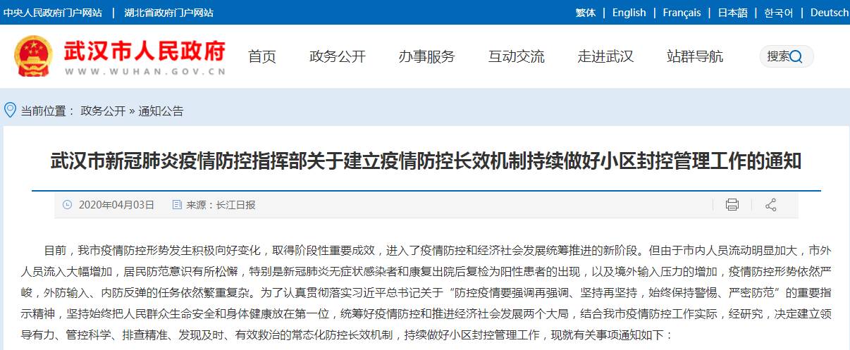 近日,武汉市新冠肺炎疫情防控指挥部发布《关于建立疫情防控长效机制持续做好小区封控管理工作的通知》。