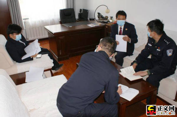 ▲两名承办检察官在做好防护措施的情况下,在医院通过视频讯问被告人郭某鹏。图片来源:最高检