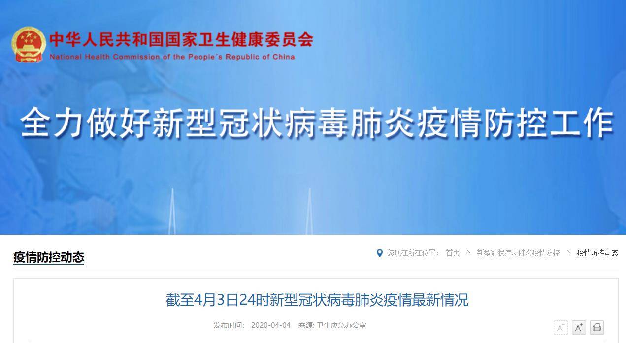 4月3日0—24时,31个省(自治区、直辖市)和新疆生产建设兵团报告新增确诊病例19例,其中18例为境外输入病例,1例为本土病例(湖北1例);新增死亡病例4例(湖北4例);新增疑似病例11例,均为境外输入病例。