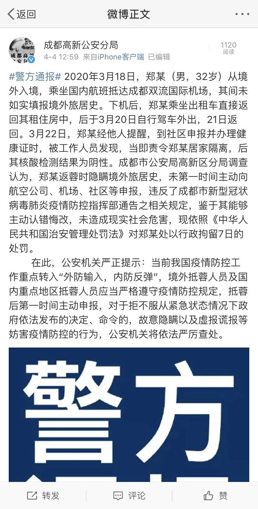 成都市公安局高新区分局调查认为,郑某返蓉时隐瞒境外旅居史,未第一时间主动向航空公司、机场、社区等申报,违反了成都市新型冠状病毒肺炎疫情防控指挥部通告之相关规定,鉴于其能够主动认错悔改,未造成现实社会危害,现依照《中华人民共和国治安管理处罚法》对郑某处以行政拘留7日的处罚。