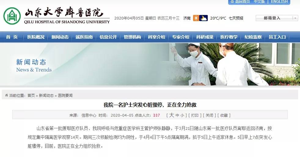 据山东大学齐鲁医院官方微信消息,山东省第一批援湖北医疗队员、该院呼吸与危重症医学科主管护师张静静,于3月21日随山东第一批医疗队员离湖北返回济南,按规定集中隔离医学观察14天。期间三次核酸检测均为阴性,于4月4日下午5点隔离期满,拟于5日上午返家休息。