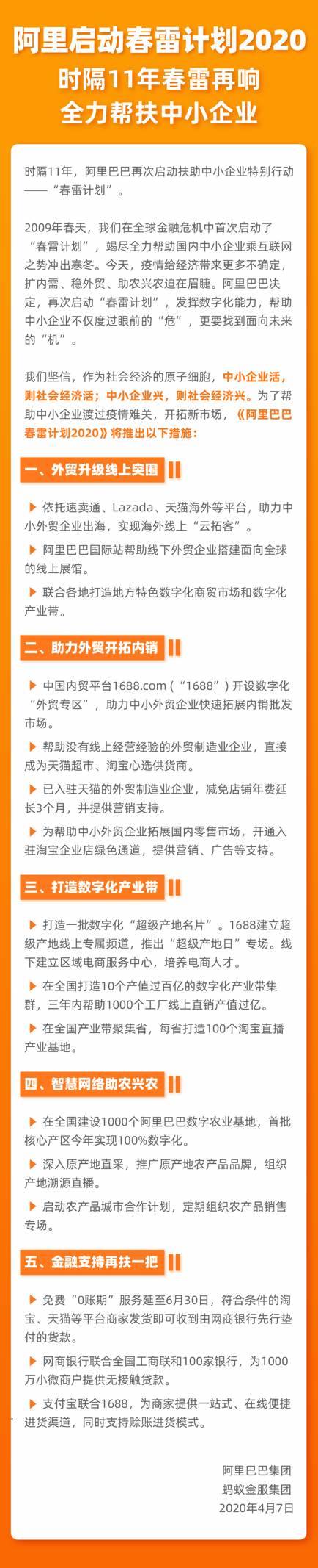 重启“春雷计划”这一天,阿里巴巴集团董事会主席兼首席执行官张勇发出一封题为《春天的战役》的全员信。“我宣布,阿里巴巴将启动‘春雷计划2020’。我们将充分利用阿里巴巴20年来沉淀的商业力量和技术力量,通过一系列硬核举措,创造新供给、激发新需求、促进新贸易,同时全力推动面向数字经济时代的新型基础设施建设,用一切必要行动帮助中小企业共渡难关。”