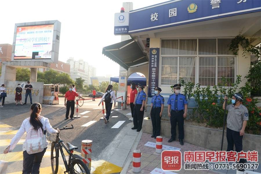 6日上午7时30分,南宁市第五十四中学门前,学生们有序间隔排队,等待测温进入校园。此次开学涉及的年级及学生较多,校门外的学生队伍也比较长。“考虑到校门附近时常会出现无证占道摆卖、跨门槛经营、共享单车乱停放等市容乱象,为防止这些乱象对学校的防疫工作造成影响,我们提前与校方沟通制定了开学保障方案。”现场执法人员说。