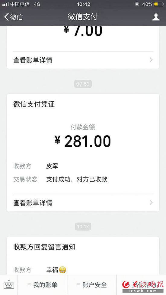“司机问了我一些问题,然后不到10分钟的样子就到了湖南农大。在图书馆前面的五头牛雕塑那儿停车。司机输入一个数字后要我微信付费,我一扫,发现要付281元,就问怎么要这么多。那司机也没回头,只是不断重复‘早跟你说了是专车’。我听得有点发麻,就想开车门,但门是锁住的。”小黄告诉记者,在僵持了一会儿后,因为害怕司机又把她拉到别的地方,她不得已用微信支付了281元,之后才下了车。