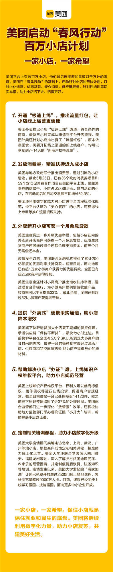 近日,在前期帮扶商户的基础上,美团宣布启动“春风行动”百万小店计划,采取线上化运营、优惠贷款、安心消费、供应链服务、针对性培训等六大举措,助力小店活下去并且活得更好。