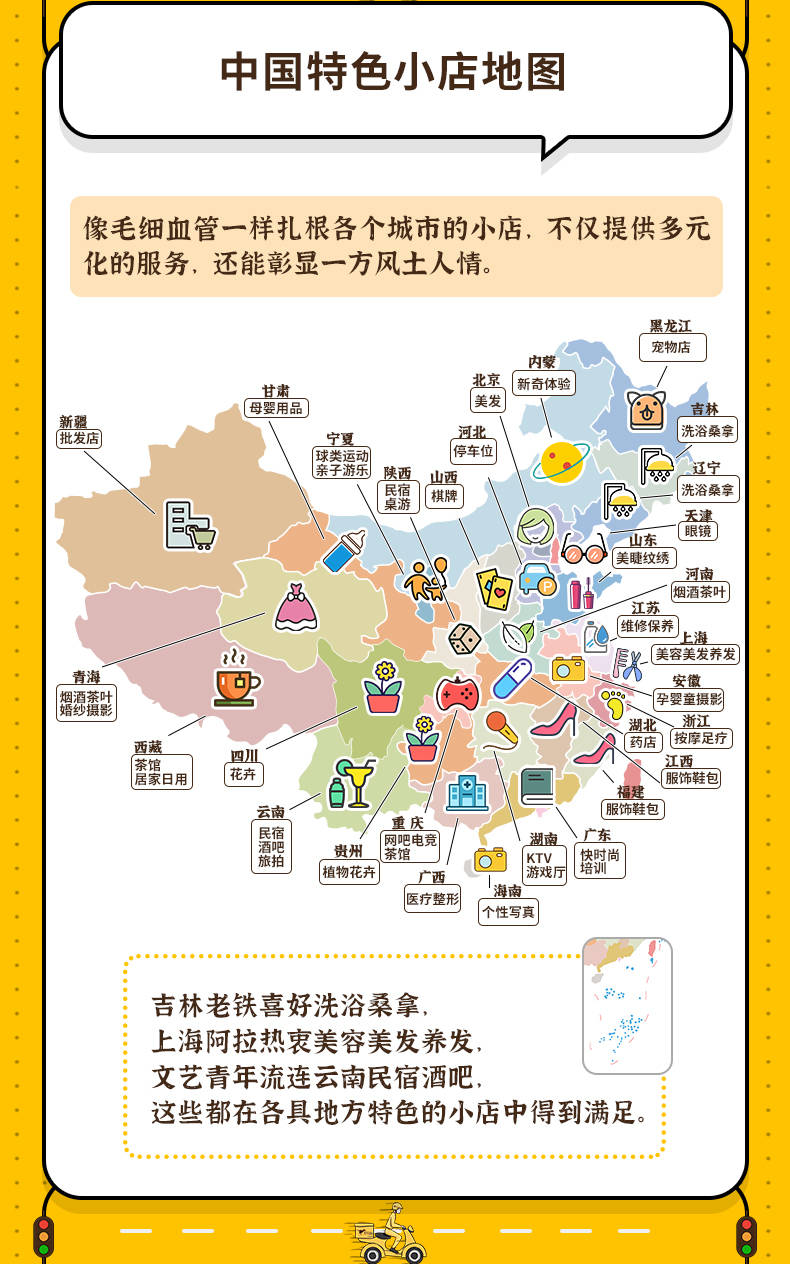 像毛细血管一样扎根各个城市的小店,不仅提供多元化的服务,还能彰显一方风土人情。《小店报告》中“中国特色小店地图”显示,吉林、辽宁老铁喜好洗浴桑拿,上海阿拉热衷美容美发养发,文艺青年流连云南民宿酒吧,这些需求都在各具地方特色的小店中得到满足。