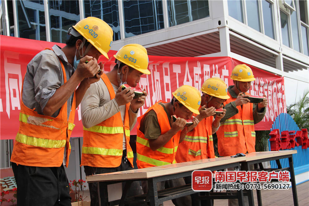 随后,活动转到中新南宁国际物流园二期K1地块项目部继续进行。来自南宁玉洞医院的防疫专家,首先给项目管理人员及工友讲解、普及预防中暑及登革热的相关知识。紧接着,活动进入吃西瓜大赛环节。24名参赛者分成5组比拼,每组的头名,再参加复赛决出前三名。