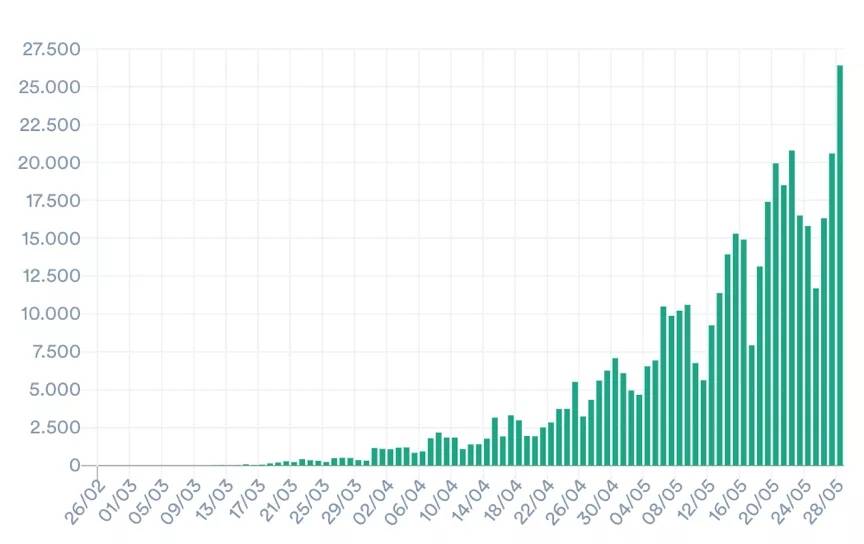 ▲巴西每日新增确诊人数曲线(来源:巴西卫生部)